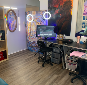 This studio has enough space for the artist and the client. I will allow a parent to be present if a client need company
